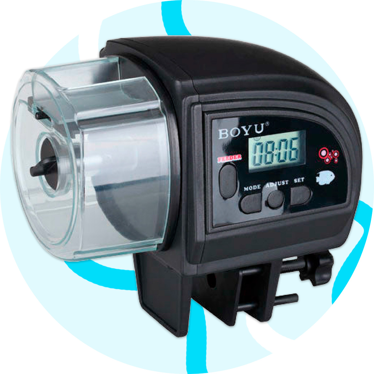 El alimentador automático BOYU ZW-82, suministra la cantidad justa de alimento con la frecuencia deseada. Puede usarse cualquier tipo de alimento seco, como escamas, gránulos, tabletas de fondo, pellets y micro-pellets.