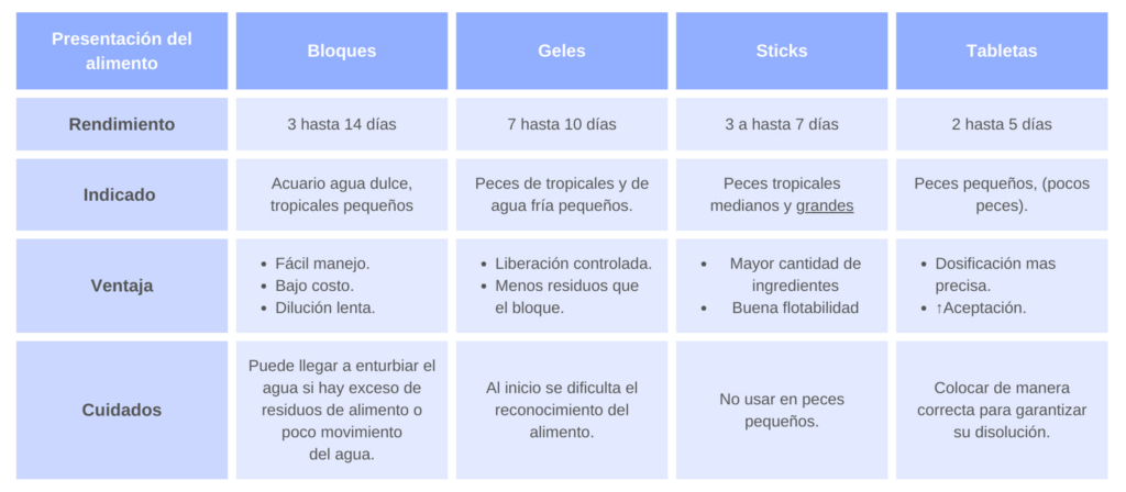 Es una presentación eficaz para alimentar a tus peces en un tiempo determinado, en un número determinado y mientras estas ausente. Estas nos garantizan una liberación progresiva de alimento y por lo tanto de nutrientes esenciales sin ensuciar el agua ni alterar sus parámetros.