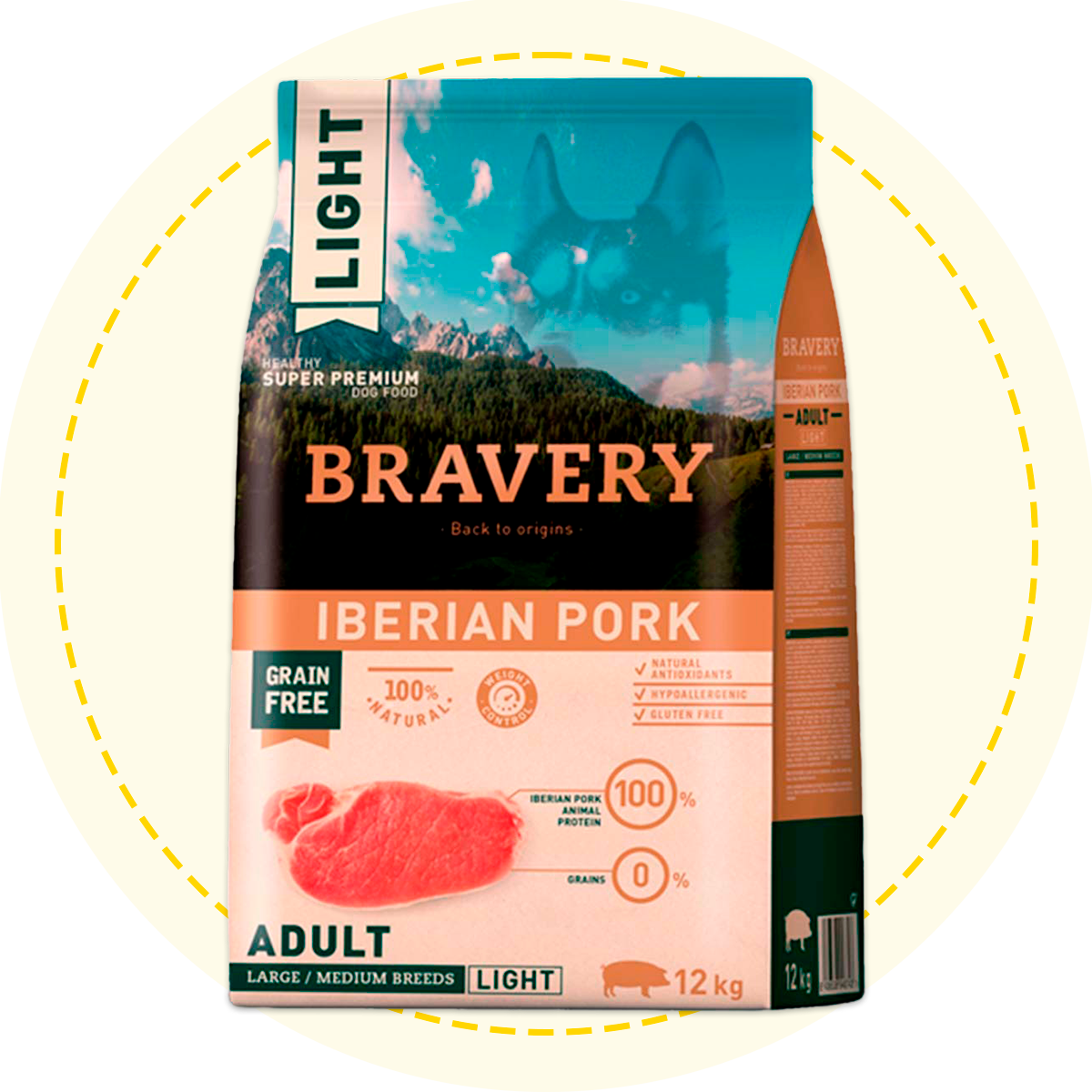 Bravery Light Alimento Seco Natural Libre de Granos para Perro Adulto Raza Mediana/ Grande Receta Cerdo, 12 kg